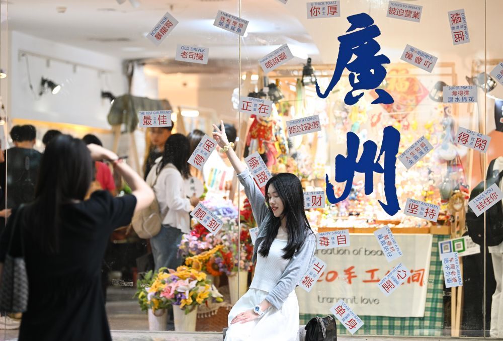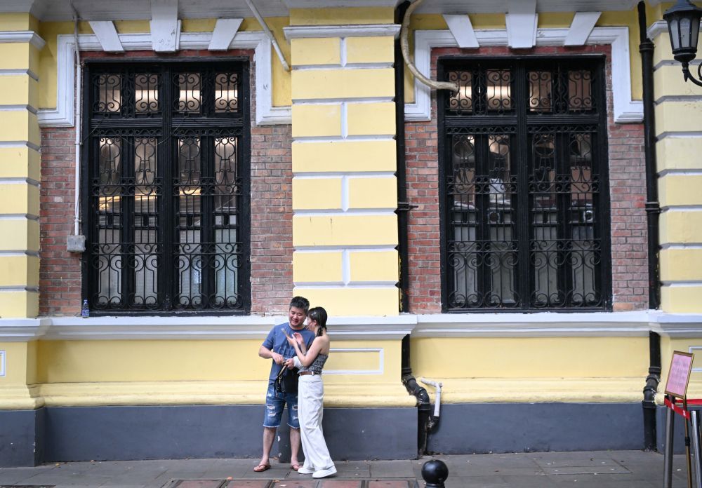 游客在广州沙面的店铺打卡拍照(4月13日摄)