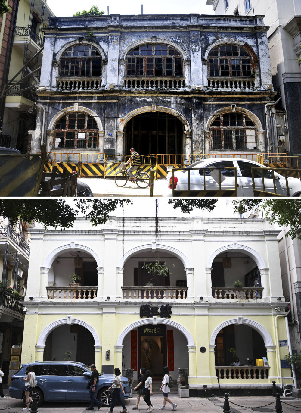 上图为2010年5月25日拍摄的广州沙面北街43号(资料照片) 下图为2024年4月17日拍摄的修缮后的广州沙面北街43号