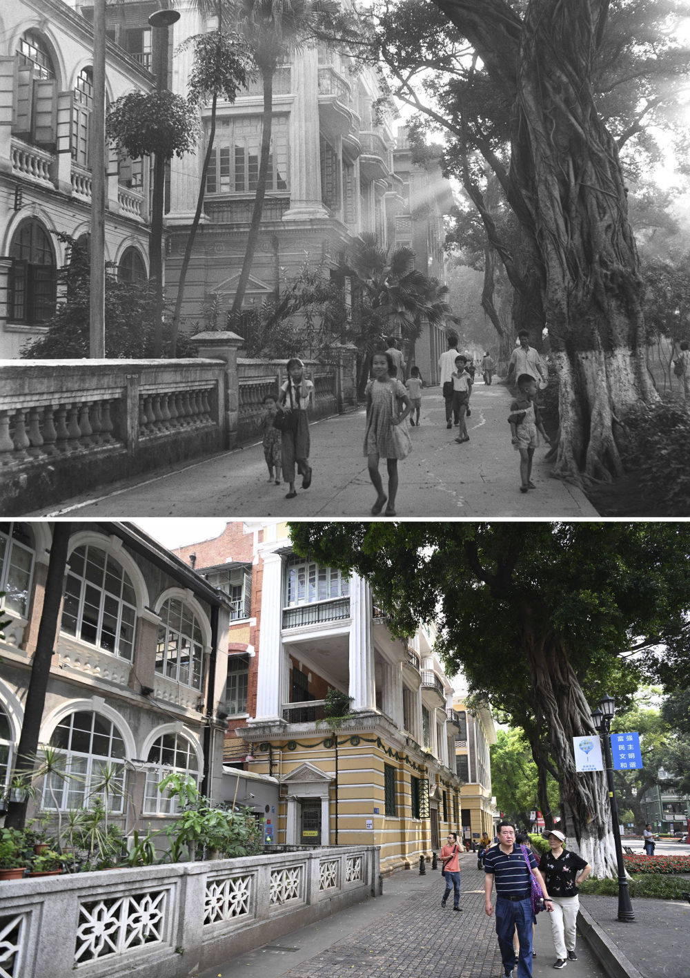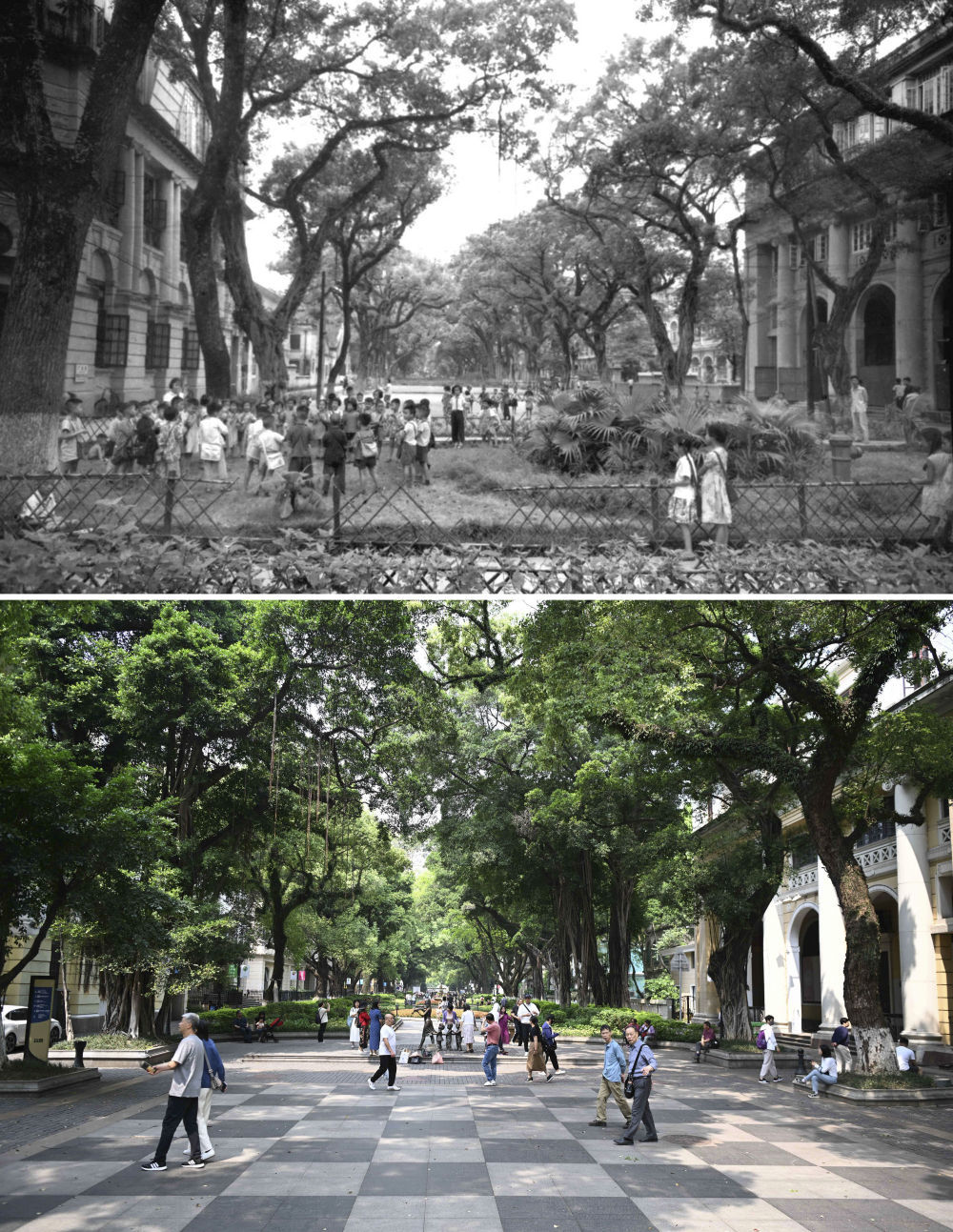 上图为广州沙面大街街景(资料照片) 下图为2024年4月11日在同一位置拍摄的广州沙面大街