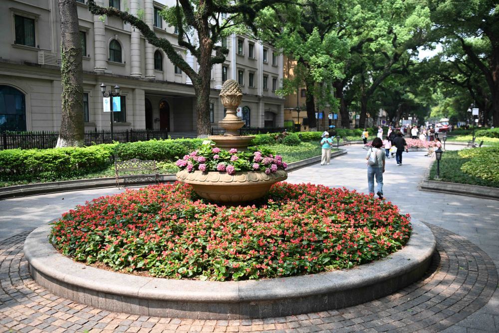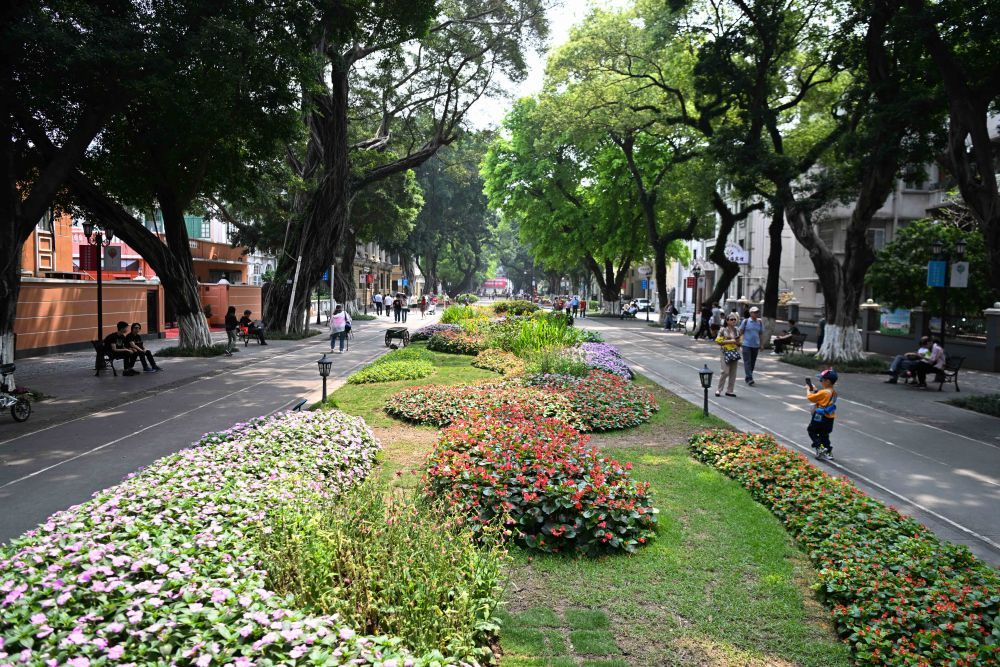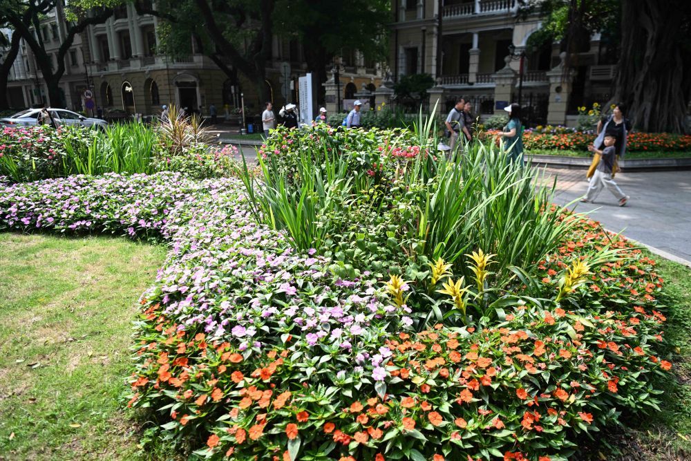 广州沙面大街上绿树成荫、鲜花盛开(4月11日摄)