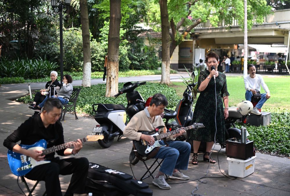 市民在广州沙面唱歌休闲(4月11日摄)
