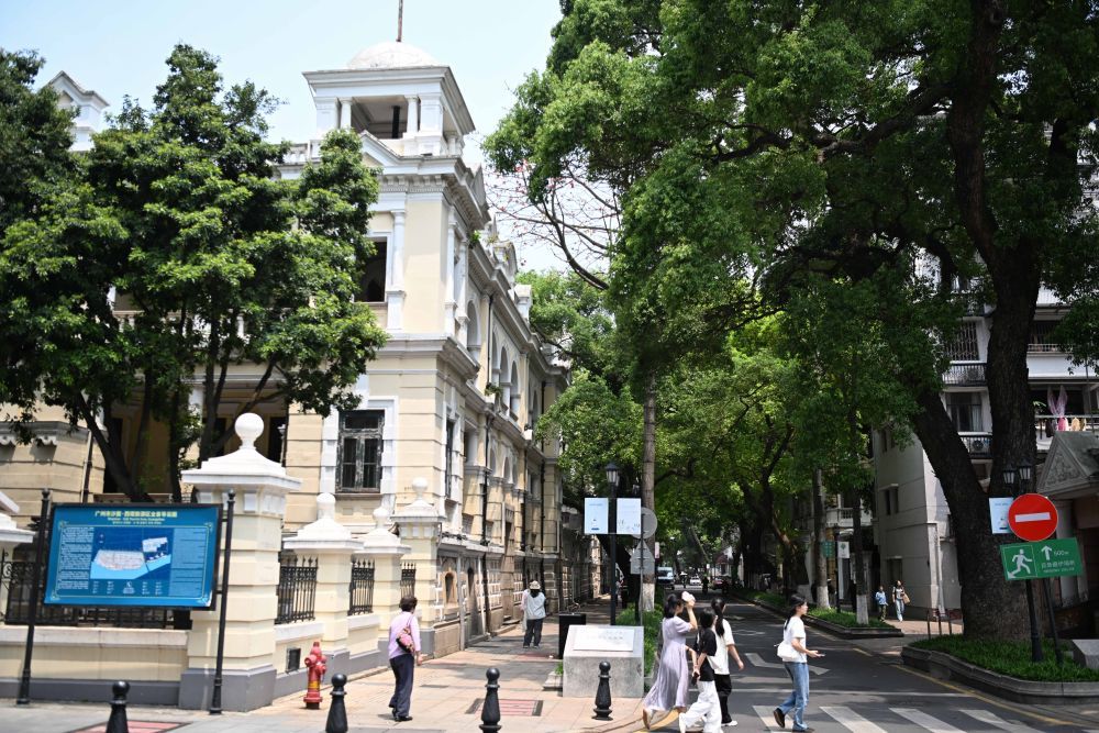 行人从广州沙面老建筑前经过(4月11日摄)