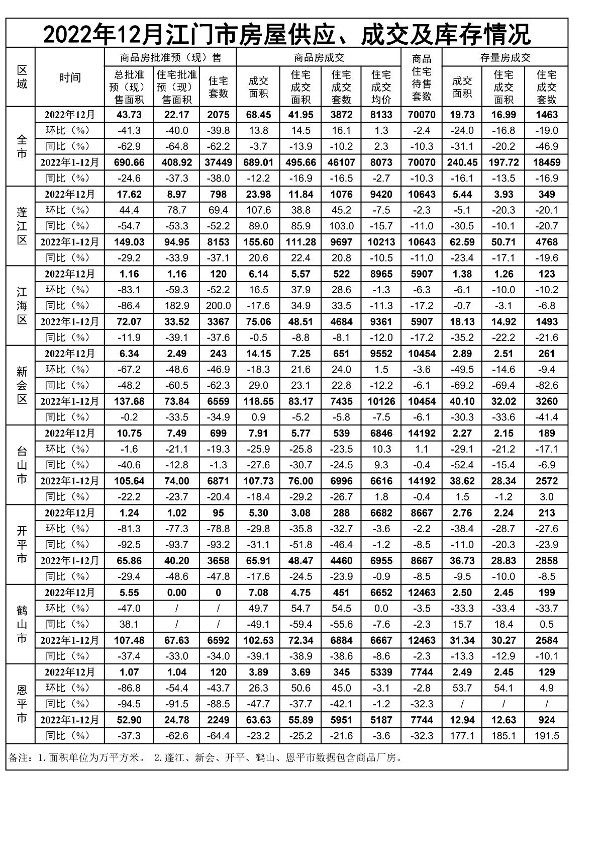 1-12月全市商品房成交面积约689万平方米,同比减少12.2%,减幅比1-11月收窄0.9个百分点;商品住房成交面积约496万平方米,同比减少16.9%,减幅比1-11月收窄0.3个百分点。其中蓬江区同比增长两成,江海区和新会区保持平稳,四市减幅较明显。