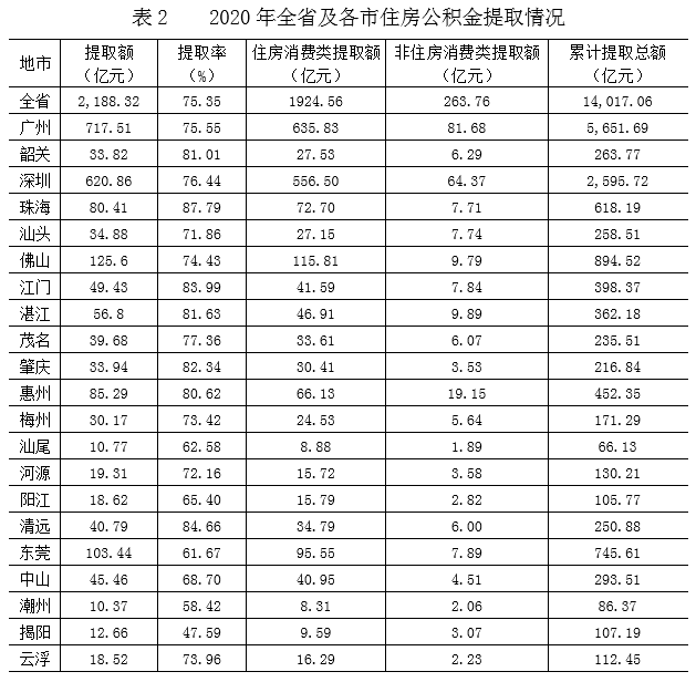 2020年,广东积极支持缴存职工按政策规定提取住房公积金,大力支持住房消费。全年支持965.77万名职工提取住房公积金2188.32亿元改善住房条件,提取额占当年缴存额的75.35%,比上年增加4.40个百分点。截至年末,累计提取总额达14,017.06亿元,住房公积金使用科学充分。