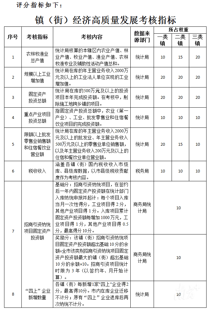 考核项目为“农林牧渔业总产值”“规模以上工业增加值”“固定资产投资总额”“重点产业项目投资总额”“限额以上批发零售业销售额和住宿餐饮业营业额”“税收收入”和“招商引资纳统项目固定资产投资额”“‘四上’企业新增数量”共8项经济指标。