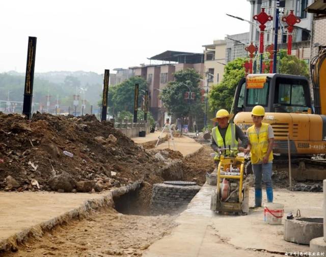 在左潭社区南岸河堤附近,工人们正在开展污水管网接网项目施工,实施雨污分流,同时优化排水,缓解镇域道路积水情况。接下来,此处还将继续开展“三线下地”项目施工,有序推进美丽圩镇“七个一”建设项目。