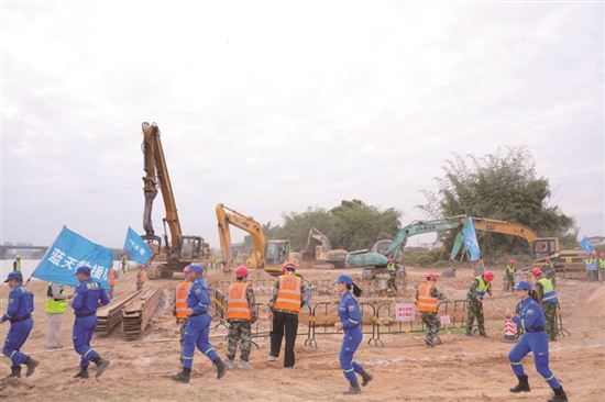 “立即按抢险方案行动!”在基槽坍塌排险环节,随着总指挥一声令下,五支抢险队伍根据专家组制定的抢险方案到各自的岗位开展抢险工作。惠州一建抢险队现场警戒;水电抢险队对坍塌处上部土方卸荷;建筑抢险队对基坑坍塌区域进行支护;铭濠润抢险队用挖掘机与装载车在附近堆土场装土;水电抢险队对20米险情段进行整平压实……最后完成抢险任务。