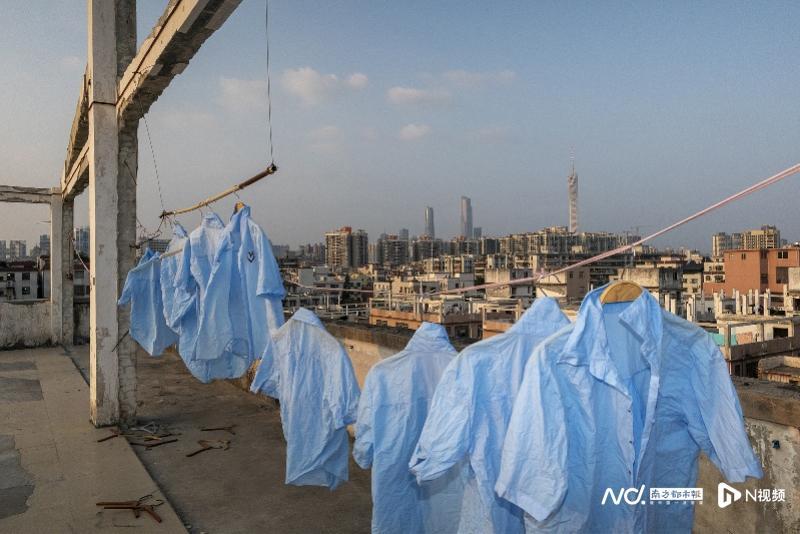 一家工厂顶楼晾晒着衣服成品。