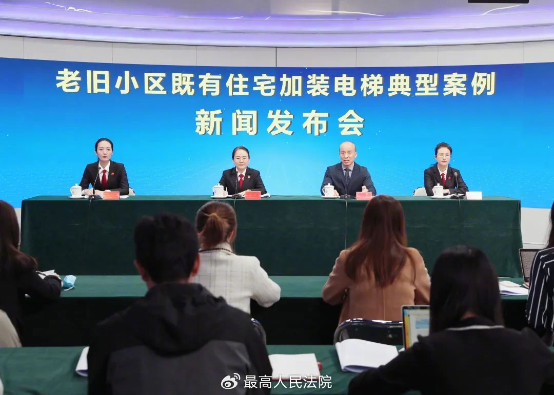 2023年11月8日上午,最高人民法院、住房城乡建设部联合发布老旧小区既有住宅加装电梯典型案例并回答记者提问。最高人民法院民一庭庭长陈宜芳、住房城乡建设部城市建设司副司长刘李峰、最高人民法院民一庭副庭长吴景丽出席发布会,发布会由最高人民法院新闻局副局长王斌主持。
