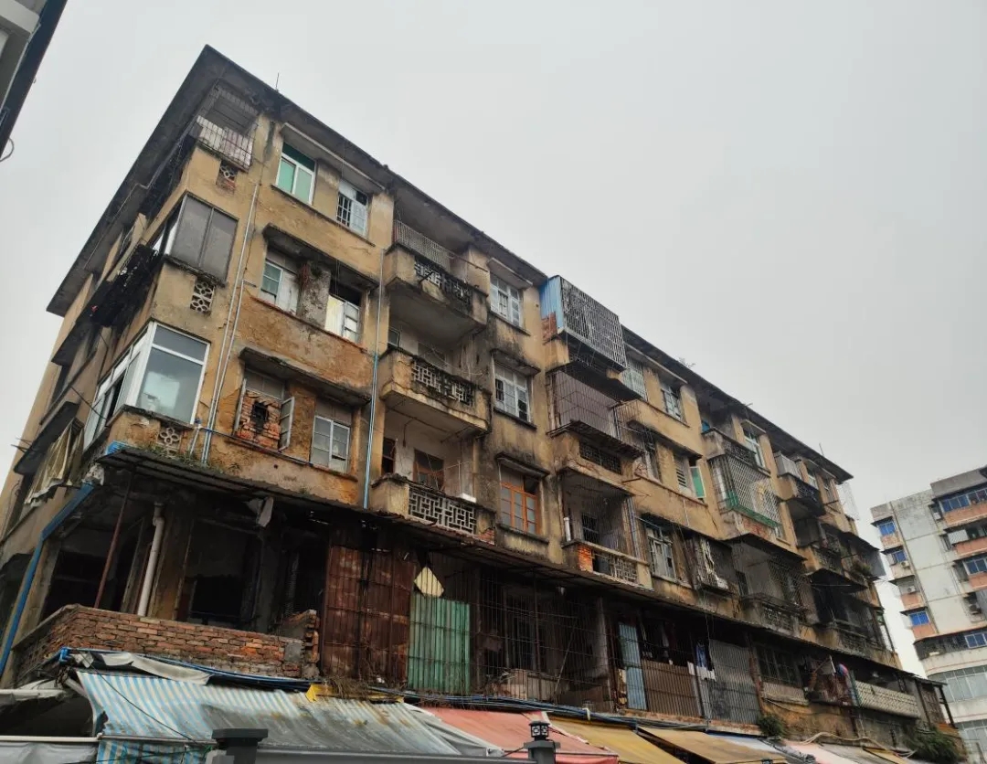 新华街道的集群街1号,占地面积373.6平方米,是一栋五层高的居民楼,污渍斑斑的土黄色外墙,雨水管、电线裸露在外,晚上乌灯黑火。这栋建筑原为居住用途,已空置十多年。2019年,房屋经过安全鉴定为严重损坏房,是居民身边的安全隐患。