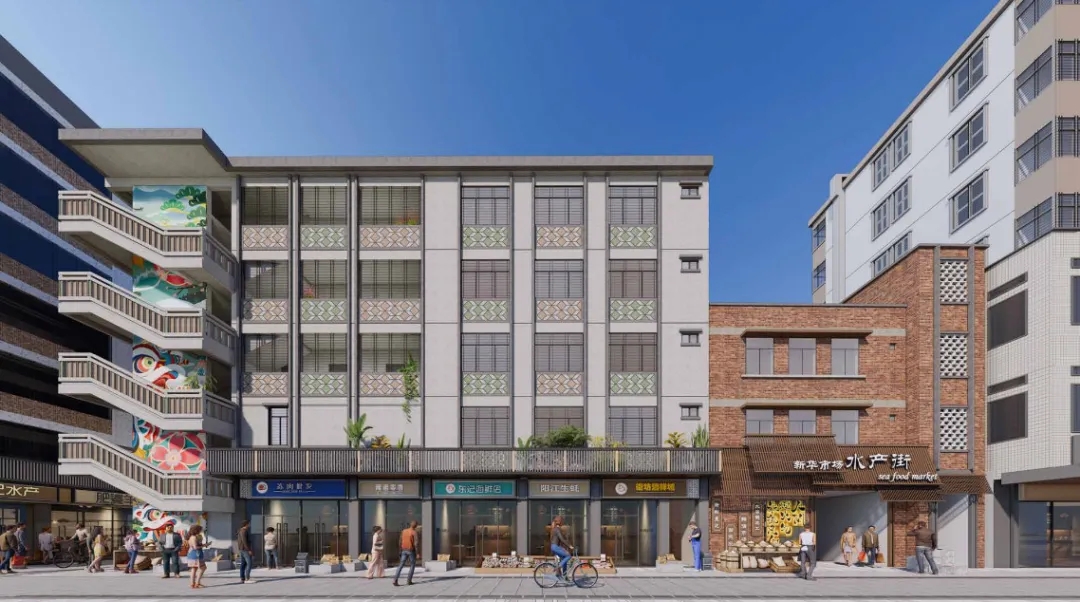 新中路是花都老城区最具烟火气的马路,拥有老花县最老派的商业步行街之一(太子步行街)、最繁华的菜市场之一(1944年始建的新华市场)、最早的电影院(花都1958影院)。项目以百年新华历史为轴,链接“站-城-园”三区域、联动“市-影-村-社”四个功能区,重构老城区新轴线,建设“市场+墟市”双核心,打造都市人情新汇聚地。